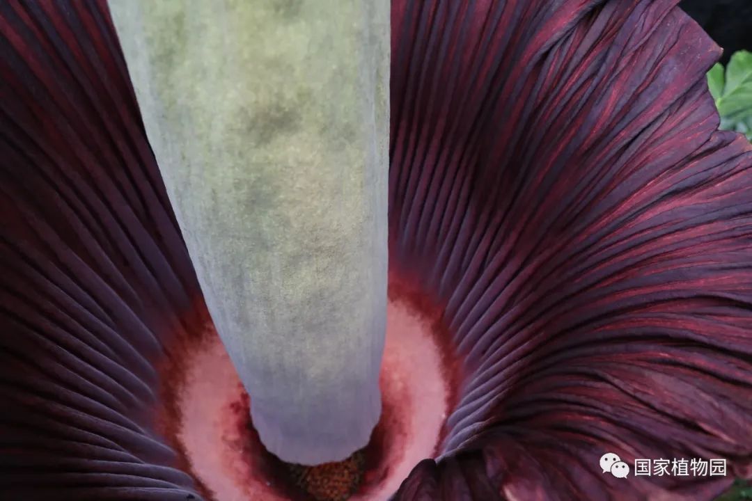 巨魔芋看上去十分巨大,但它实际上是草本植物。无论是它犹如树干粗细的叶子,还是巨大的肉穗花序,其内部结构都是高度纤维化、角质化的六棱柱子蜂窝状结构。此次巨魔芋的群体开花,也使得国家植物园可以对巨魔芋进行更细致的观察。科研人员还记录下了巨魔芋雄花出花粉的过程,并将首次对外进行公布。