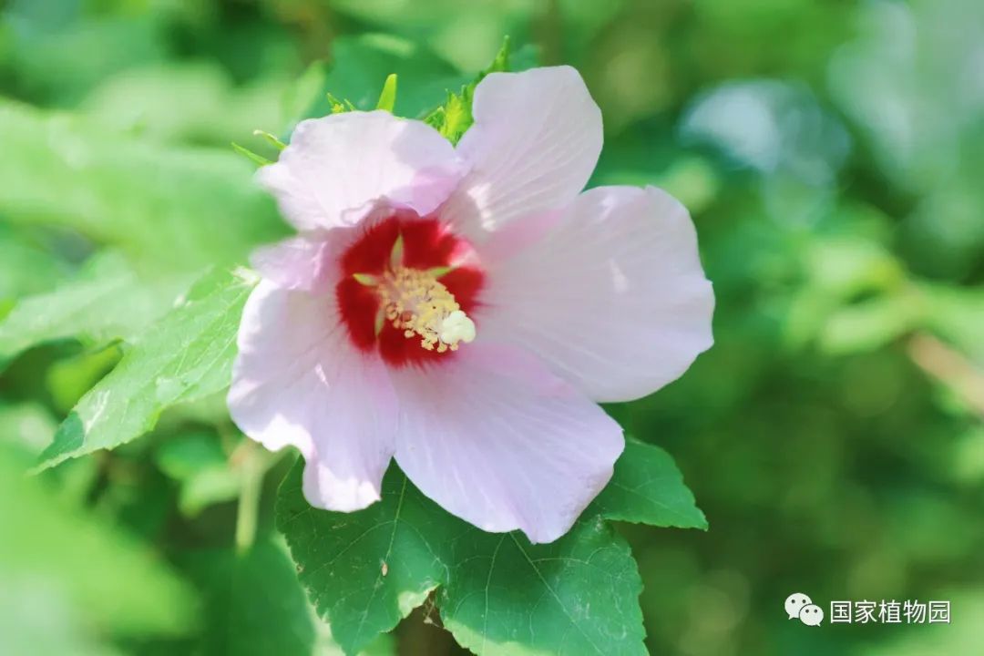 盛夏之时,又是木槿花盛开的时候。碧绿的叶片,艳丽的花朵,热热闹闹地挤在一起。花朵正中心的深红色,仿佛不经意的点缀,带来的是满满夏日色彩。