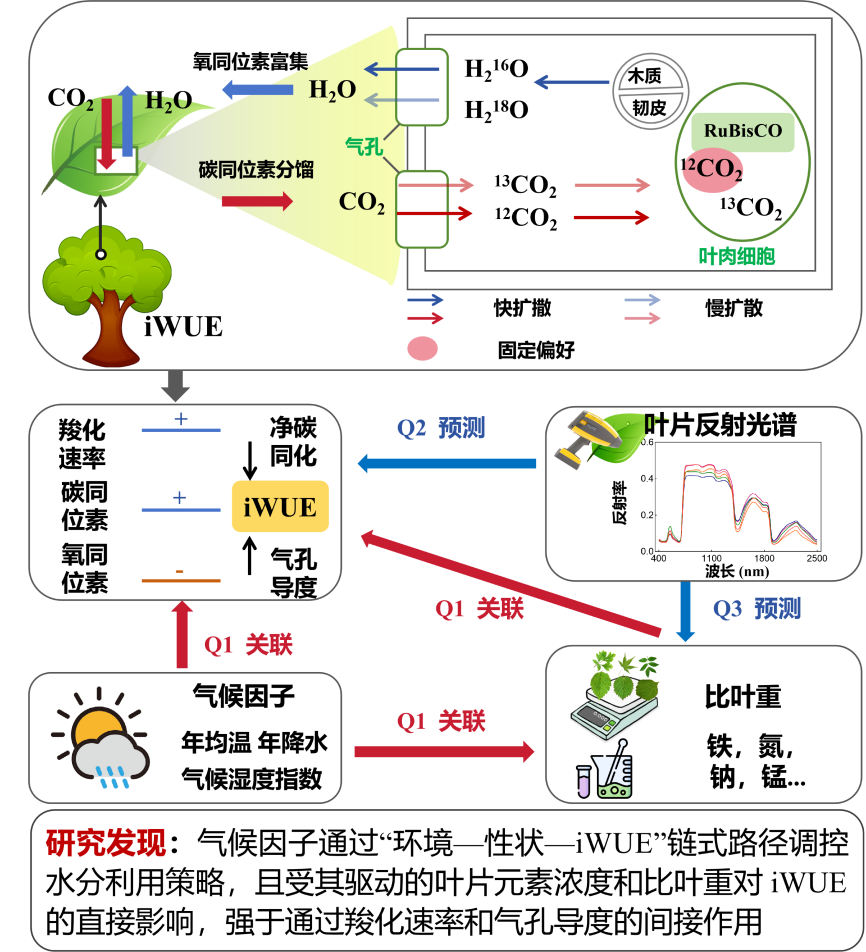 叶片内在水分利用效率(iWUE)是衡量植物碳获取与水分消耗权衡的关键指标,对于理解森林生态系统碳–水循环耦合及其对环境变化的响应具有重要意义。然而,对于不同森林类型中植物水分利用策略的差异及其受哪些关键叶片性状和生化特征调控,仍缺乏系统性认识。尽管羧化能力、气孔导度和多种叶片功能性状已被用于解释iWUE变异,但关于叶片元素组如何在跨气候带尺度影响水分利用策略的证据十分有限。铁、锰、钙、钠等元素在光合作用电子传递、光系统结构稳定和气孔调控中发挥重要作用,但其协同调节机制尚未被系统揭示。同时,反射光谱技术能否准确表征iWUE及其性状关联仍缺乏跨森林生态系统的验证。这些知识空缺限制了我们对森林碳–水耦合机制的理解,也影响了生态模型对未来森林碳水循环和植物适应策略的预测。