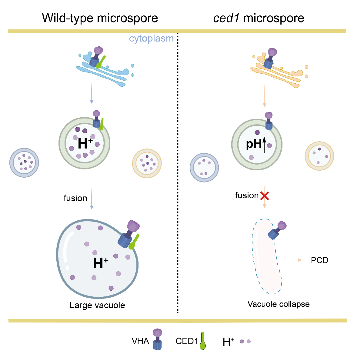 近日,国家植物园(南园)王台研究团队以番茄为材料研究发现,CED1特异性地在减数分裂阶段的花粉母细胞和四分体中表达,其蛋白定位于质膜-内膜系统。CED1功能缺失导致完全雄性不育,该不育表型并非源自绒毡层异常,而是起因于小孢子发育异常。突变体小孢子无法形成中央大液泡,液泡质子稳态异常,激活液泡介导的PCD进程,染色质异常凝聚和片段化。进一步研究发现,CED1与液泡H⁺-ATP酶(VHA)c亚基互作,维持液泡质子稳态与酸性环境;因此,CED1功能缺失导致液泡pH值上升,最终触发液泡崩解和PCD。该研究不仅揭示CED1-VHA-c模块作为“液泡酸化监控-PCD执行”的分子开关控制小孢子命运,更为番茄等作物杂种优势利用提供了关键基因模块。