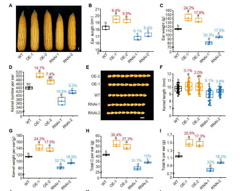 近日,国家植物园(南园)王柏臣研究团队在该领域取得重要进展。研究团队通过对456个玉米自交系进行全基因组关联分析,并结合104个自交系的候选区段关联分析,初步确定磷酸烯醇式丙酮酸羧激酶(PEPCK2)与玉米产量、穗轴长度、氨基酸含量等多个重要农艺性状相关。为深入探究其功能,研究团队利用基因编辑技术敲除该基因后发现会导致胚胎致死,说明该基因对玉米发育至关重要。随后,研究人员通过RNA干扰技术降低其表达,并构建过表达株系,系统验证了该基因的功能。结果表明,过表达PEPCK2能显著增加穗轴长度、百粒重、籽粒产量及含氮量,实现碳氮含量同步提升;而降低其表达则出现相反表型。