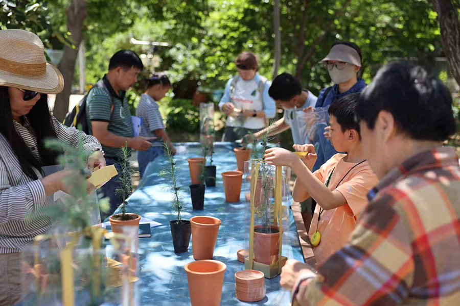 活动围绕“知识讲解 — 自然观察 — 繁育实践”展开:知识讲解环节,科研人员在壳斗区集合点,结合图文展板与雪松枝叶、球果标本,详细解读雪松 “跨亿年的生存智慧”,从地质变迁中适应高寒环境的演化历程,到针叶蜡质层、深根系等耐寒结构,再到其在不同文化中的象征意义,同时对比松科其他植物特征,帮助参与者建立清晰认知;自然观察环节,沿园区定制路线行进,除重点观察不同树龄的雪松外,还串联梧桐、红豆杉、皱叶荚蒾等植物,解析雪松与周边植被的生态互动关系,途中同步介绍繁育温室里崖柏、秤锤树等珍稀植物的保护现状;繁育实践环节,科研人员现场示范雪松育苗流程,从陶盆挑选、营养土配比,到初期浇水频率等细节逐一指导,参与者亲手完成育苗操作后,可将盆栽带回家养护,配套发放的活动手册还包含后续生长观察记录表,进一步延伸体验周期。