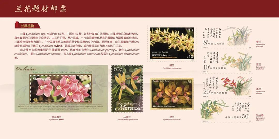 此次展览精选了来自亚洲、欧洲、非洲、大洋洲及美洲等100个国家和地区的600余枚兰花题材邮票,为大家带来一场跨越国界的兰花文化盛宴。本次展览邮票种类丰富,涵盖了极限片、小全张、小型张、大全张、大版张、小版张、异形邮票、四方连等多种形式,其中不乏具有科普价值与收藏意义的珍品。邮票中不仅包括兰属Cymbidium、兜兰属Paphiopedilum、杓兰属Cypripedium、石斛属Dendrobium等具有代表性的兰花植物邮票,还特别展出了兰花界的“动物精灵”邮票。例如,美丽蝴蝶兰Phalaenopsis amabilis、粗指天鹅兰Cycnoches