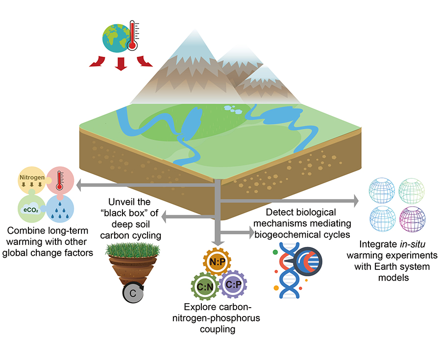 国家植物园(南园)杨元合研究组通过总结已有文献,发现气候变暖通过改变植被群落组成、调节植物功能性状以及延长生长季长度等途径,促进了高寒草地植被碳吸收能力。同时,增温显著影响了土壤微生物群落结构以及与碳循环相关的功能微生物特征,进而调节了土壤碳的分解与积累。增温并未改变土壤碳储量,但导致土壤碳组分发生显著变化,表明土壤碳稳定性可能正发生潜在转变(图1)。在此基础上,研究人员提出未来研究应重点关注以下5个方面:深层土壤碳循环过程对增温的响应;增温情景下碳氮磷循环的耦合;增温影响生物地球化学循环的生物学机制;大气CO2浓度升高、氮沉降、降水格局改变等其他全球变化要素与增温的长期交互作用;增温实验数据与地球系统模型的深度融合(图2)。