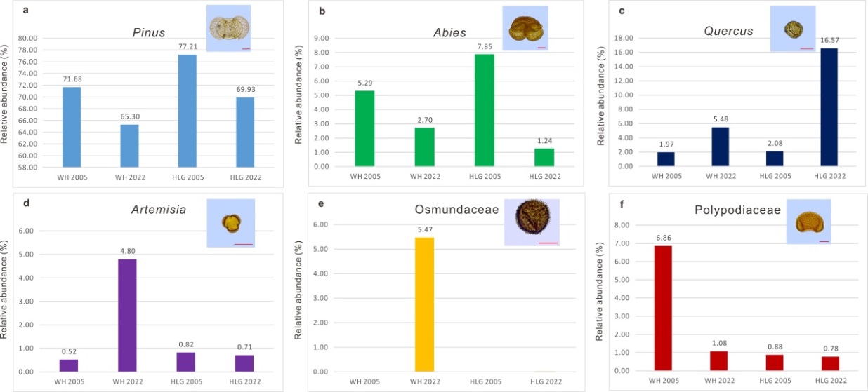 国家植物园(南园)王宇飞研究团队与英国爱丁堡皇家植物园合作,通过分析2005年和2022年采自横断山区玉龙雪山南坡文海和哈里谷的现代样品,基于花粉组合差异追踪了当地的环境变化。研究人员发现,冷杉花粉丰度的显著下降和常绿栎花粉丰度的快速上升较好地指示了2005年—2022年以来研究区域的气候变暖,而蒿属花粉和陆生蕨类紫萁科孢子的增加,以及附生蕨类水龙骨科孢子的减少,表明该时间段人类活动的明显增强。该研究不仅揭示了气候变化和人类活动对植被的可能影响,而且提供了一种简易的方法用于快速评估生物多样性相对短期的变化,同时该研究提出对表层土壤样本进行长期比较研究,服务监测特定地点的植被变化。