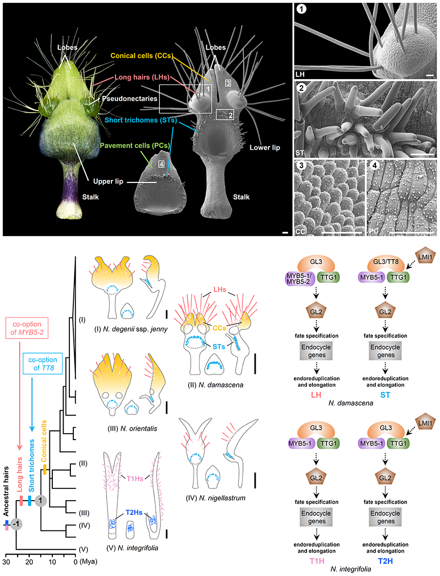国家植物园(南园)孔宏智研究团队以毛茛科(Ranunculaceae)黑种草属(Nigella)植物为研究体系,综合运用多种技术方法,系统研究了锥形细胞、短表皮毛和长表皮毛这三种凸起细胞的细胞学特征及其发育和进化机制。研究发现,尽管锥形细胞、短表皮毛和长表皮毛均为单细胞结构,但它们在形状、长度、数量、分布模式、表面纹饰、细胞倍性、发育过程和形成机制等方面均存在明显差异。MIXTA(其同源基因在多个物种中决定锥形细胞或表皮毛的身份)仅参与锥形细胞的发育,但并不调控长、短表皮毛的形成。两类表皮毛的命运均由MYB-bHLH-WDR复合体-GL2通路成员决定,但关键调控因子的组合并不完全相同。其中,短表皮毛的命运由MYB5-1、GL3、TT8和GL2决定,而长表皮毛的命运则由MYB5-1、MYB5-2、GL3和GL2决定。在生态学功能上,短表皮毛作为微型支柱,使花瓣上、下唇之间保留微小缝隙,以便传粉者吸食花蜜。进一步研究发现,黑种草属植物花瓣上的长、短表皮毛均起源于类似长毛的祖先细胞;二者的进化分别涉及对MYB5-2和TT8的独立招募。该研究不仅首次全面探讨了同一器官上不同类型凸起细胞之间的区别与联系,而且为深入理解花瓣复杂化(特别是表面复杂化)和新性状起源的机制提供了新见解。