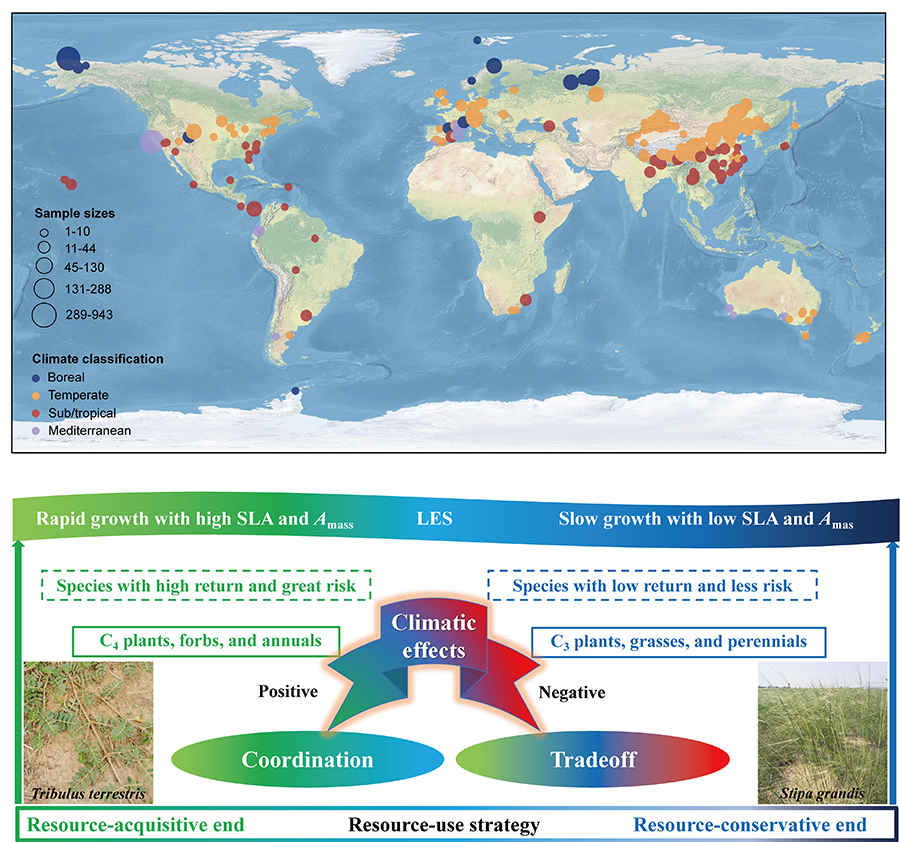 全球观测点的空间分布格局(上)和植物功能性状关系概念示意图(下)