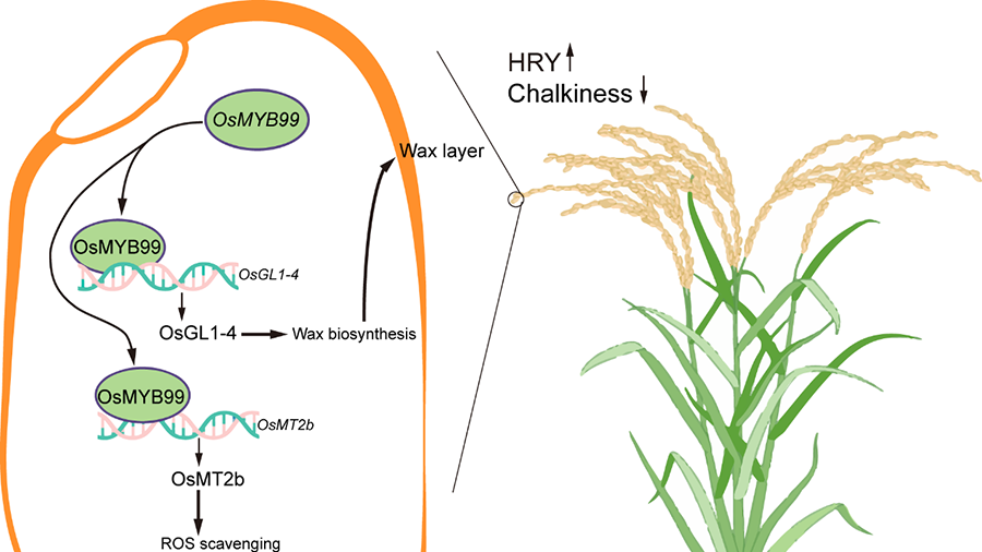 国家植物园(南园)王台研究团队揭示了水稻整精米率和垩白性状的关键调控模块OsMYB99及其分子网络。OsMYB99是一个R2R3型MYB转录因子,通过对糙米表皮蜡质合成与沉积及胚乳活性氧(ROS)稳态的双重调控,增强整精米产量、降低稻米垩白率。进一步研究揭示,OsMYB99结合蜡质合成基因OsGL1-4和ROS清除基因OsMT2b的启动子,促进其表达。OsGL1-4促进蜡质生物合成和表皮蜡质沉积,进而影响籽粒的水分交换和裂纹抗性;而OsMT2b通过清除胚乳中过量的ROS,维持胚乳ROS稳态,阻止胚乳细胞出现异常的细胞程序化死亡,两者协同作用提升整精米率并降低垩白率。该研究揭示了OsMYB99及其分子网络在水稻整精米和垩白品质性状形成过程的重要作用,提出了一个通过靶向调节表皮蜡质合成与沉积及ROS稳态改良稻米的新策略。