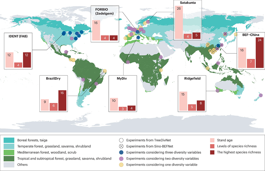 全球位于72个地点的45个森林生物多样性实验概览