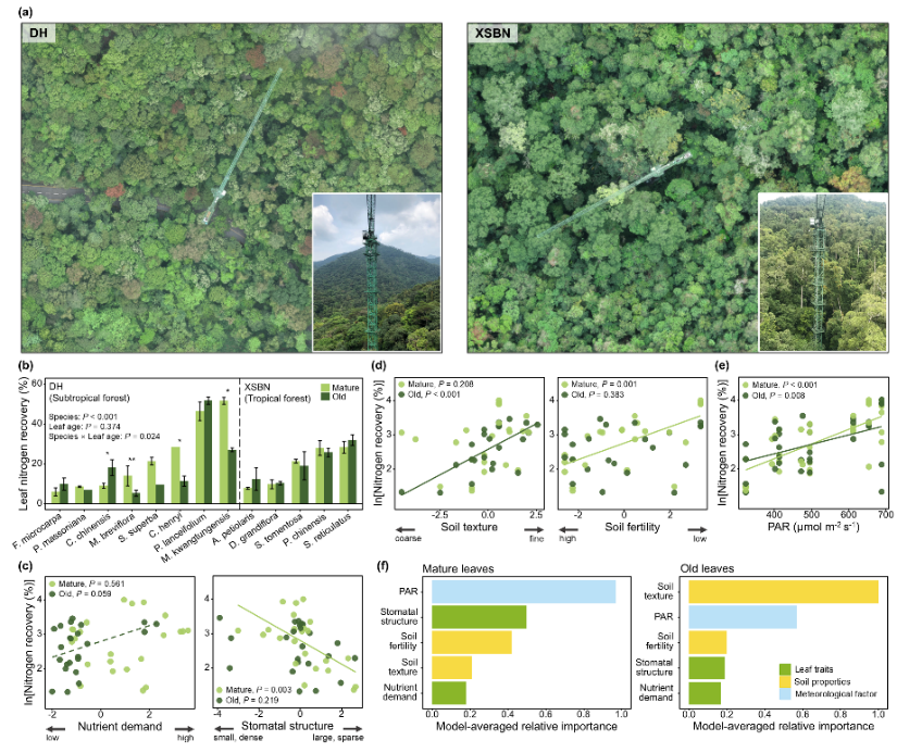 国家植物园(南园)刘玲莉研究团队依托中国生态系统研究网络(CERN),在配备林冠塔吊平台的鼎湖山(亚热带常绿阔叶林)和西双版纳(热带雨林)两个野外台站,利用稳定性氮同位素(15N)示踪技术,量化了13个冠层优势树种成熟叶和老叶的叶片氮吸收能力,并进一步解析了叶片功能性状、土壤条件及气象因子对叶片氮吸收的调控机制。结果发现,在热带和亚热带天然林中,不同物种及不同叶龄叶片的氮吸收能力存在较大变异(5.3%~51.6%)。总体来看,成熟叶(21.4%)和老叶(19.6%)的平均氮吸收能力相近,但其调控机制存在明显差异。养分需求较高且气孔密度较大的叶片表现出更强的氮吸收能力。光合有效辐射(PAR)是促进两种叶龄叶片氮吸收的主要气象因子,而较高的土壤肥力会抑制成熟叶的氮吸收。进一步分析表明,对生理活性较高的成熟叶而言,叶片性状(如气孔结构和养分需求)是解释其氮吸收能力的关键因素;而对于老叶来说,叶片性状的重要性显著降低,环境条件,特别是土壤质地和光合有效辐射,成为影响氮吸收的主导因素。本研究定量评估了自然森林生态系统中冠层树木不同叶龄的叶片氮吸收能力,并揭示了成熟叶与老叶在氮吸收调控机制上的显著差异,为深入理解森林氮循环提供了关键科学依据。