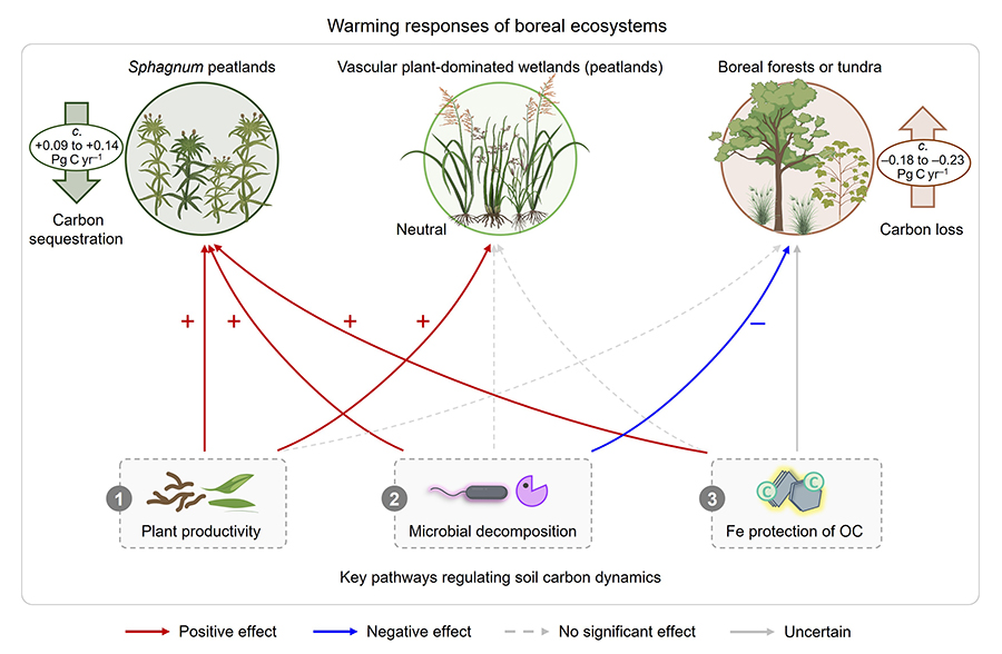 国家植物园(南园)冯晓娟研究团队联合芬兰赫尔辛基大学及芬兰气象局等单位,依托芬兰两个野外长期(6—16年)增温实验平台,结合涵盖93项野外增温研究的整合分析,从植物输入、微生物分解与金属氧化物保护等途径,对比了增温背景下北方泥炭藓湿地与北方森林、苔原等生态系统土壤碳动态的响应差异及其调控机制。